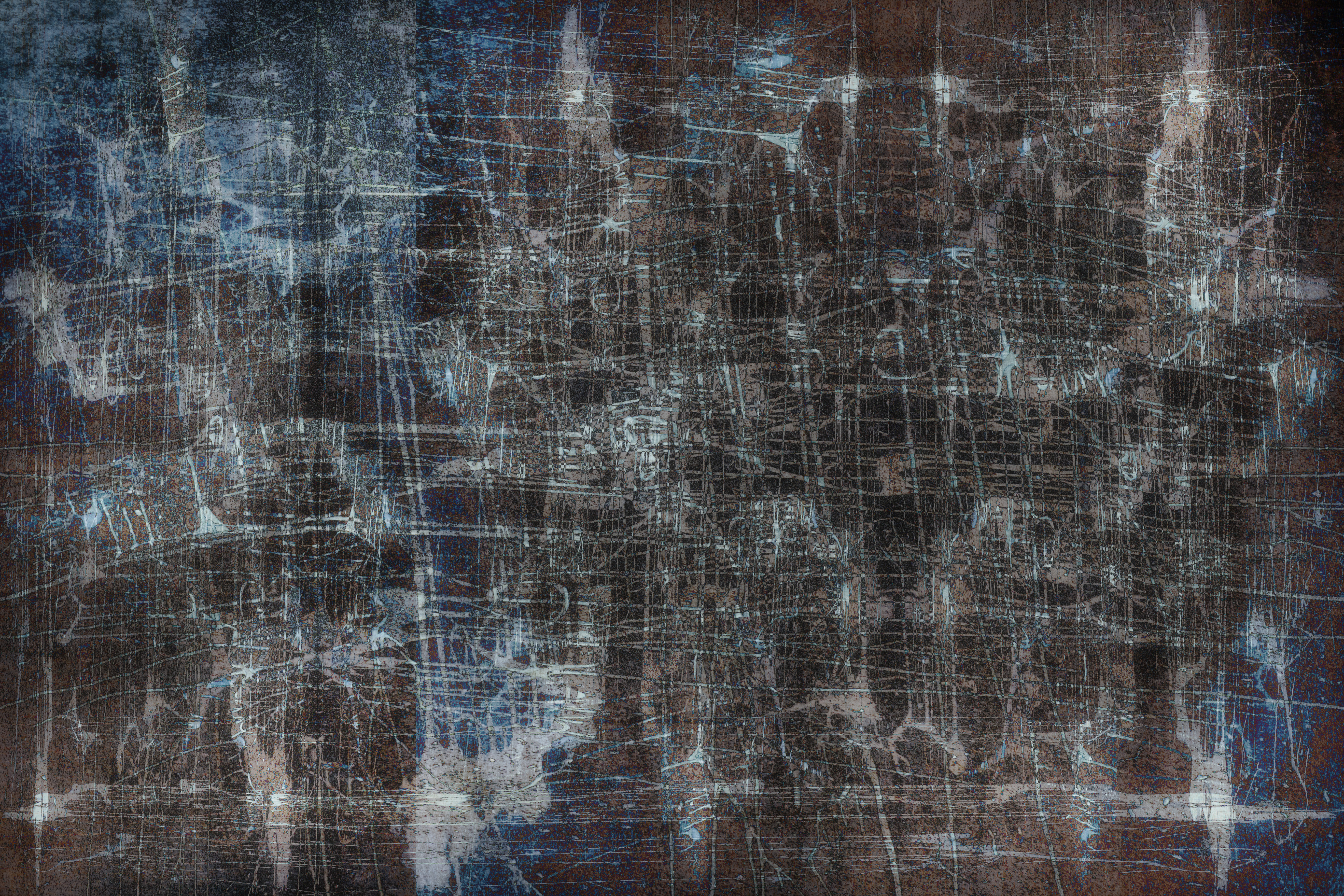 In Photoshop is opened the raw file added contrast etc because I wanted the "squiggles" to stand out more. Then I began to add layers of the photo, rotating and repositioning them as as what felt right. Each layer I would either use the "exclusion" or "difference" function. When I was finished I had a wonderful abstract mess that I could use as a texture. The original was in color but I also converted it to black & white to use on monochrome photos.